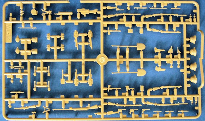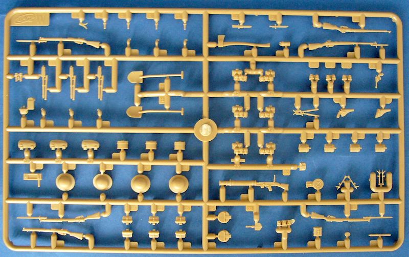 Die Gussäste B und C enthalten die hervorragend gestalteten typische Waffen, Ausrüstungsgegenstände und Helme beider Seiten. Besonders gut gefallen mir die englische Offizierspistole mit und ohne Holster sowie das Vickers MG. Ebenso erwähnenswert ist die Tatsache, dass bei den Gewehren die Verschlüsse als separate Teile ausgeführt sind. Leider geht die Bauanleitung nicht auf den Zusammenbau der Mehrheit der Gegenstände ein. Das Gleiche gilt auch für die deutschen Ausrüstungsgegenstände, bei denen mir die Luger- und Mauserpistolen mit und ohne Anschlagkolben extrem gut gefallen. Auch hier liegt ein MG bei, das aus vier schön gestalteten Einzelteilen zusammen gebaut werden muss.