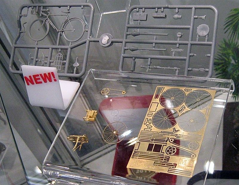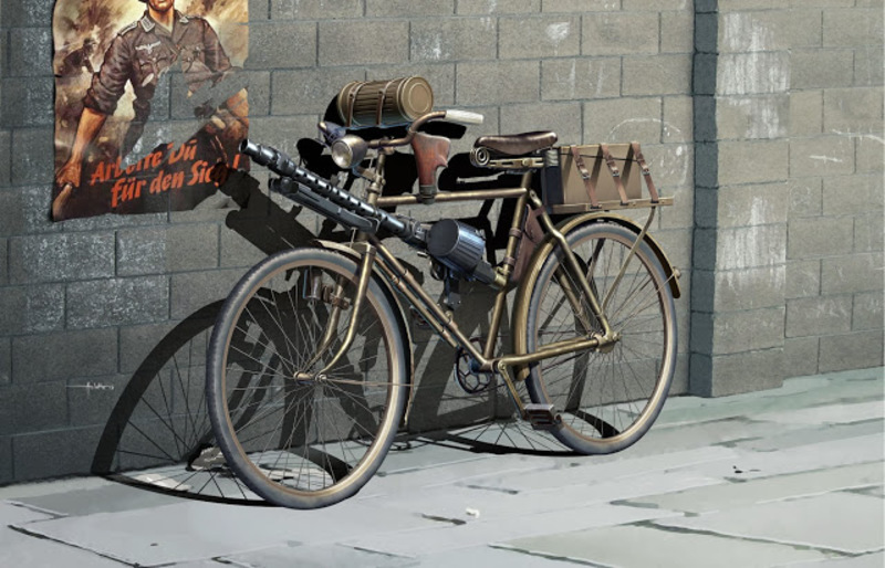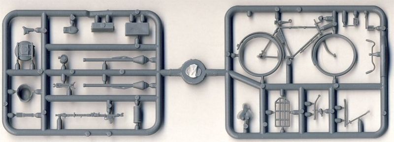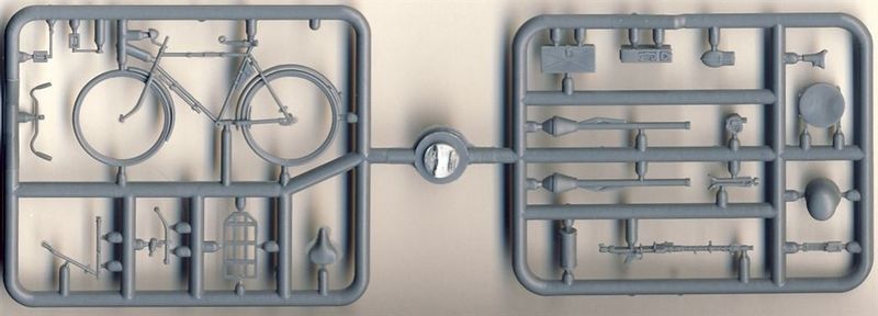 Der hier vorliegende Spritzrahmen ist ein Vorabspritzling (Testshot) von Master Box. Er enthält die Bauteile für ein deutsches Militärfahrrad aus der Zeit des Zweiten Weltkriegs. Es lassen sich verschiedene Ausrüstungsvarianten erstellen. Zum späteren Auslieferungszustand gehört noch eine Ätzteilplatine. Der in grau gegossene Spritzrahmen enthält 21Teile.