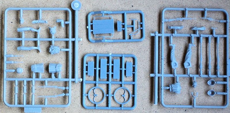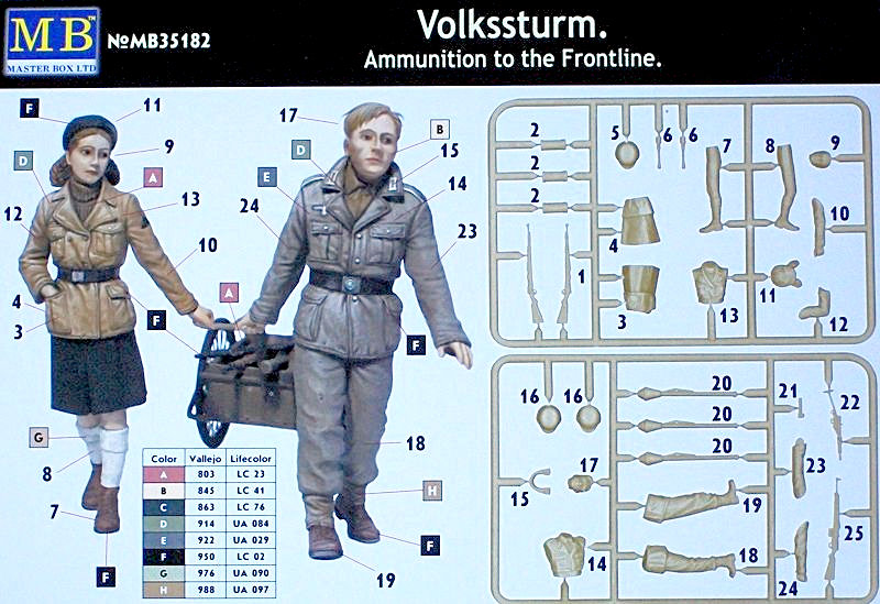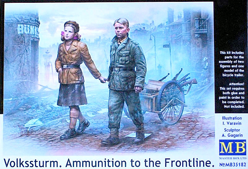 Bausatz: Der vorliegende Figurensatz von MB zeigt einen Jugendlichen mit Freundin, die einen Handkarren mit Fahrradrädern, voll mit Waffen für die "Front" ziehen. Die beiden Figuren sind sauber und gratfrei gegossen. Der Handkarren ist filigran gegossen und für die Speichen der Räder liegt ein Ätzteilsatz bei. Die Bauanleitung für den Handkarren liegt als Beilage im Bausatz, die für die Figuren befindet sich auf die Rückseite der Verpackung, ebenso die Farbvorlage. Der Karton ist leider von der wabbligen Sorte.