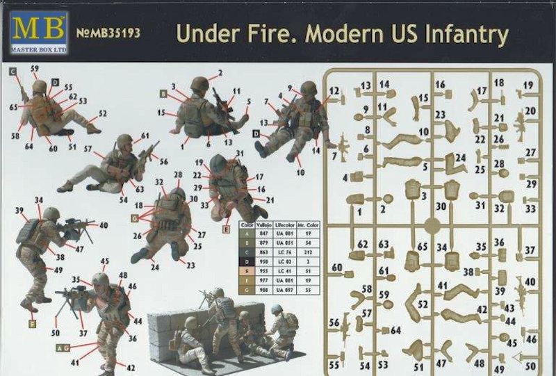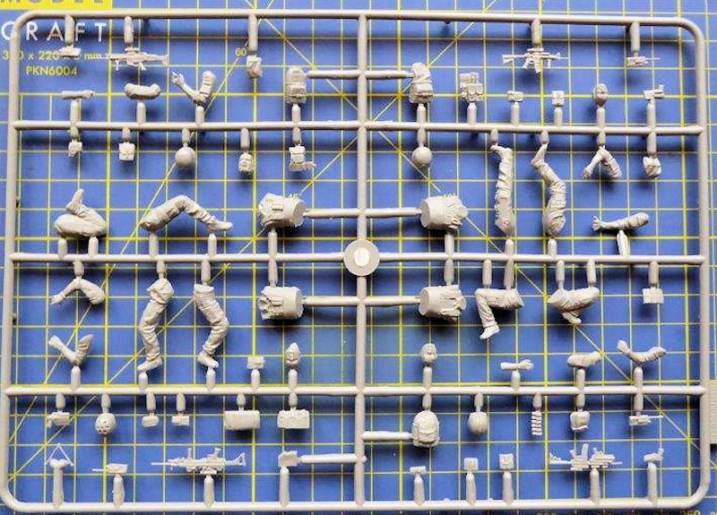 Der hellgraue Spritzling enthält alles für vier Soldaten: einem MG-Schützen, einem verwundeten GI, einen Sanitäter und einen Deckung suchenden Infanterist. Alle Figuren sind sehr gut detailliert. Es gibt massig Ausrüstungsgegenstände. Auch die modernen Waffen wie M4 Carbine und die anderen Schnellfeuerwaffen lassen an Detailfülle nichts zu wünschen übrig. Aufgrund der Posen der Figuren lassen sie sich gut in ein Diorama einbauen.