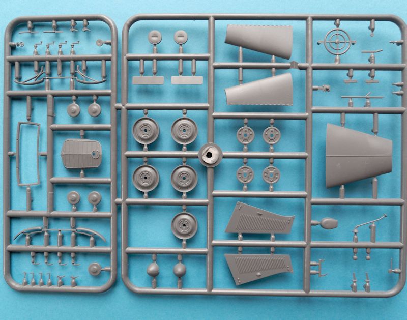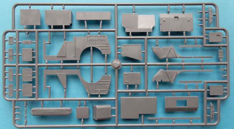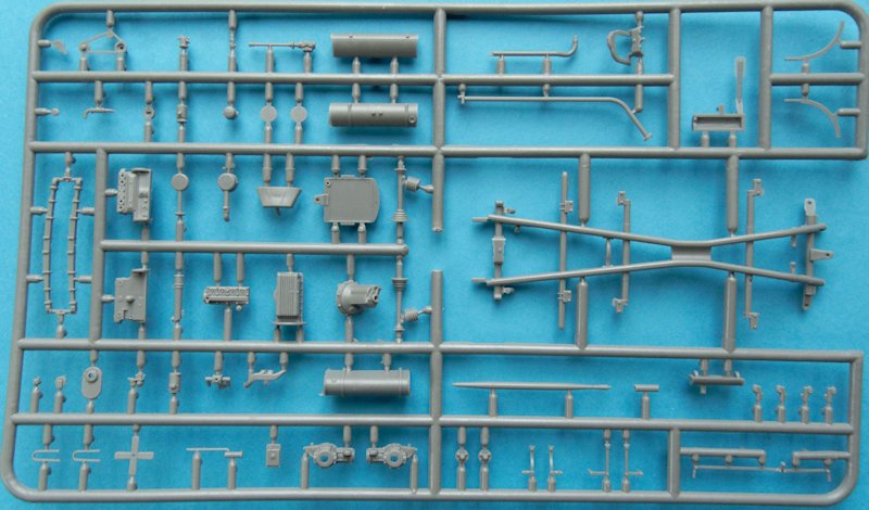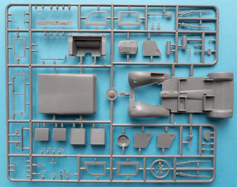 Die Detaillierung und Passung der einzelnen Teile ist sehr gut umgesetzt. Es sind zwar keine Ätzteile enthalten, die ,eigentlich auch nicht benötigt werden da die Kunststoffteile gut umgesetzt sind. Sehr kleine und empfindliche Teile können notfalls auch aus dünnem Draht angefertigt werden, wie z.B. der sehr dünne Schalthebel oder die Gewehrhalter. Der Bausatz bietet mehrere Versionen dieses Wagens an. Neben den separaten Seitenrahmen der Scheiben ist auch ein offenes oder geschlossenes Dach und sogar zwei verschiedene Kühler für Sommer- und Winterbetrieb beigelegt. Die Funkausstattung besteht aus drei Kästen die entweder in den Innenraum oder im Kofferraum platziert werden können. Hier bieten sich viele Möglichkeiten dieses Fahrzeug in einem Diorama darzustellen.