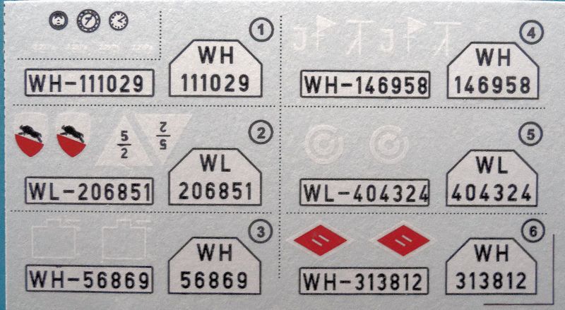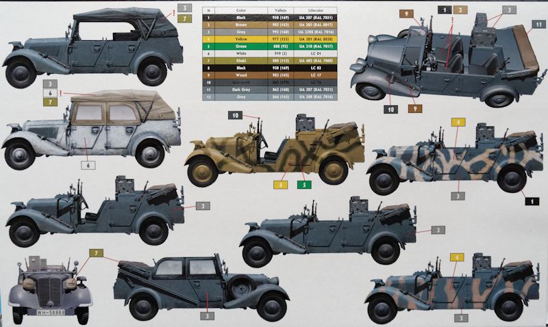 Bemalung: Die Rückseite des Kartons enthält fünf Farbversionen, die keinen genauen Einheiten zugeordnet sind. Der Decalbogen enthält, neben den Anzeigen für die Armaturen, sechs verschiedene Nummernschilder, bestehend aus vier Wehrmachts- und zwei Luftwaffen-Zulassungen. Die Farbtabelle bezieht sich auf das Sortiment von Vallejo und Lifecolor.