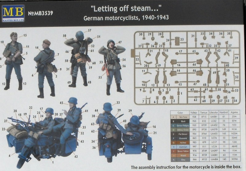 Bausatz: Hinter diesem Bausatz verbergen sich ein komplettes Beiwagenkrad und vier Figuren. In der traditionellen Schüttelbox befinden sich gut verpackt zwei Spritzgussrahmen, eine Bauanleitung und ein Decalbogen. Die Nachbildung der BMW R 75 sieht sehr stimmig aus. Einige Teile sind leider nicht so fein, wie in diesem Maßstab möglich. Die Speichen ins noch etwas grob getroffen und auch nicht frei von Grat: Die Proportionen scheinen insgesamt zu stimmen. Schon der Motor ist ein kleines Gedicht. Selbst an Alternativteile (z.B. vorderes Schutzblech) hat MasterBox gedacht. Wer möchte, der kann den Hauptscheinwerfer auch ohne Verdunklung bauen. Das MG und auch die Sattel sind gut nachgebildet. Insgesamt lässt sich daraus ein schönes Modell bauen.