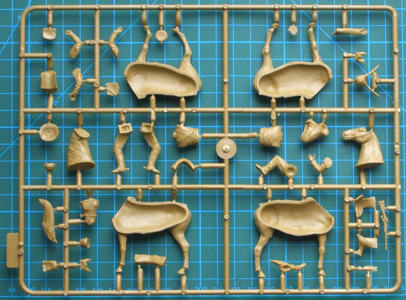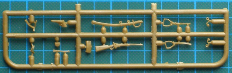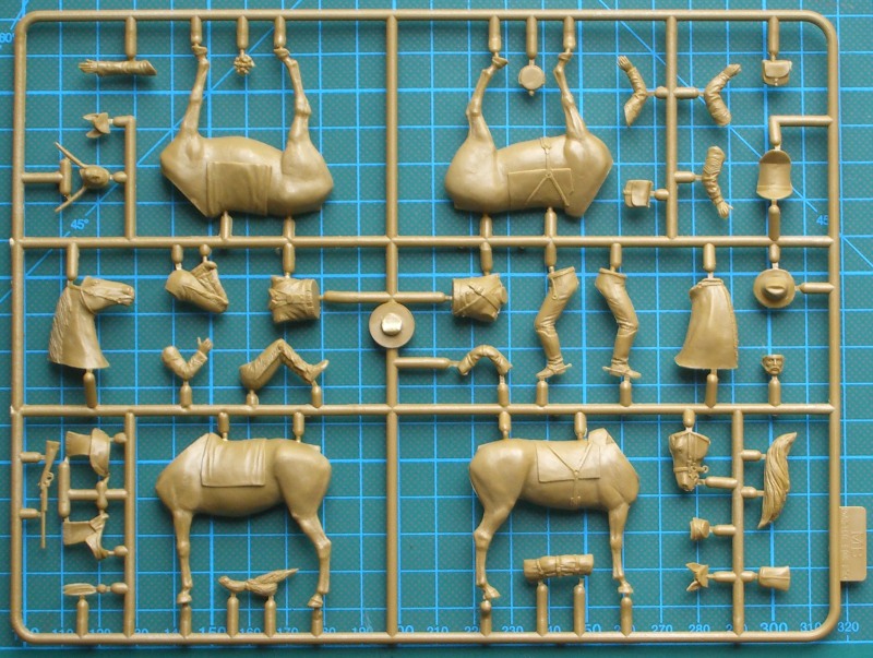 Bausatz: In einem attraktiven Schüttkarton befinden sich zwei Spritzlinge mit insgesamt 50 Teilen. Der Kunststoff ist relativ hart und lässt sich auch gut bearbeiten. Die Aufteilung der Bauteile ist sinnvoll gewählt. Es sind dadurch schöne Details möglich. Gut gelungen ist insbesondere die Ausrüstung. Es lassen sich aus den Bauteilen ein auf dem Pferd sitzender Yankee und ein knieender Indianer mit seinem Pferd bauen.