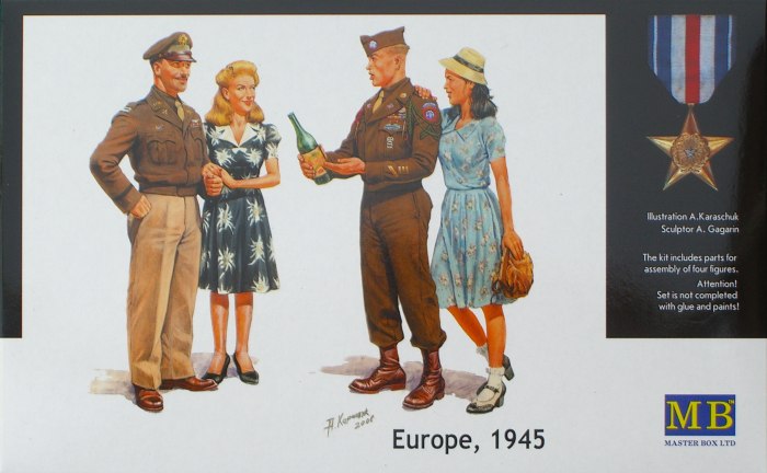 Bausatz: Master Box ist immer für ausgefallene Themen gut. Dieser Bausatz enthält vier gut modellierte Figuren. Es gibt zwei Pärchen, die etwas zu feiern haben. Der männliche Part wird durch zwei US Soldaten gestellt. Und die Frauen sind frei wählbar. Das Cover zeigt sie in der Bekleidung (und den Mustern) der damaligen Zeit. Schade, ein paar Decals hätten die Darstellung der typischen Kleider vereinfacht.