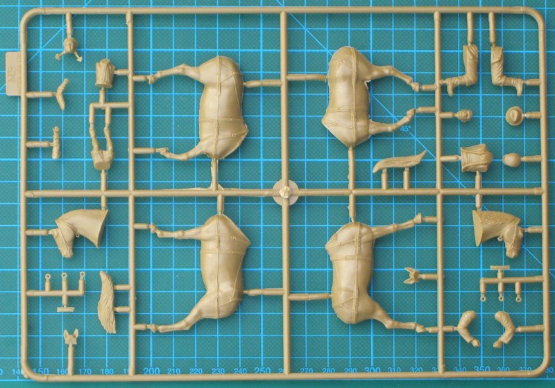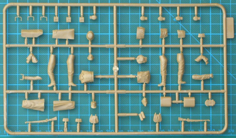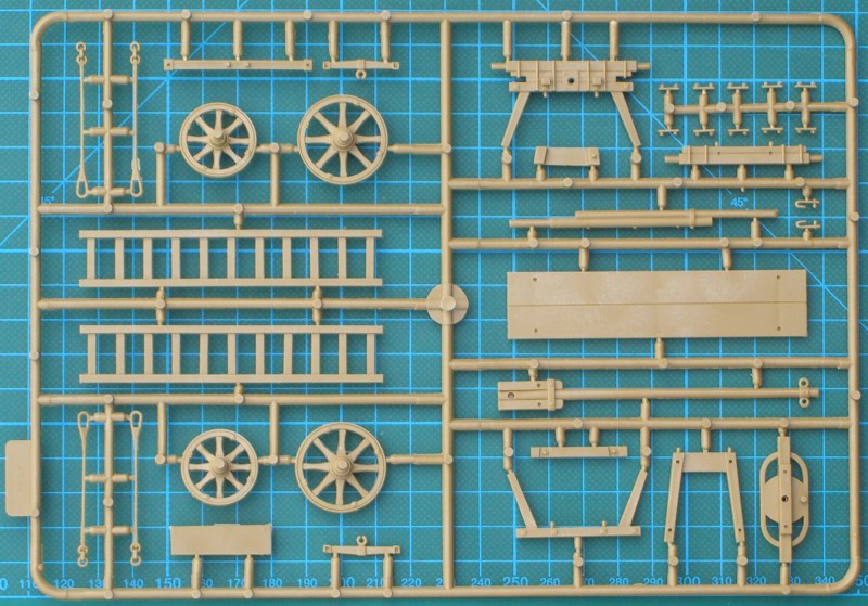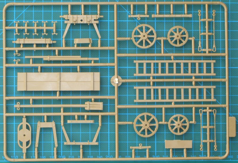Der Bausatz enthält drei hellbraune Spritzlinge und eine Bauanleitung für den Leiterwagen. Die Bauteile sind wieder sehr gut detailliert und besitzen kaum Grat. Schön natürlich sehen auch die Pferde aus. Für das Anbringen des Geschirrs gibt es in der Bauanleitung eine sehr gute Skizzen. Bei der Mädchenfigur sind tolle Zöpfe vorhanden. Beide Landser bestehen aus gut detaillierten Bauteilen.