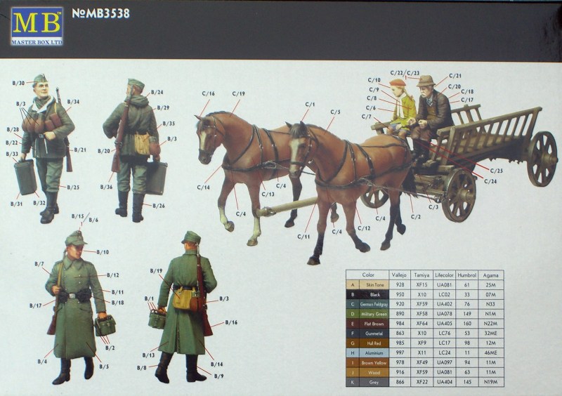 Als Bauanleitung für die Figuren dient die Rückseite des Kartons. Dort gibt es eine Teileskizze und die einzelnen Figuren sind mit den Nummern der Einzelteile versehen. Das ist übersichtlich und ausreichend. Die Farbangaben sind für die Farbsysteme von Vallejo, Tamiya, Lifecolor, Humbrol und Agama.