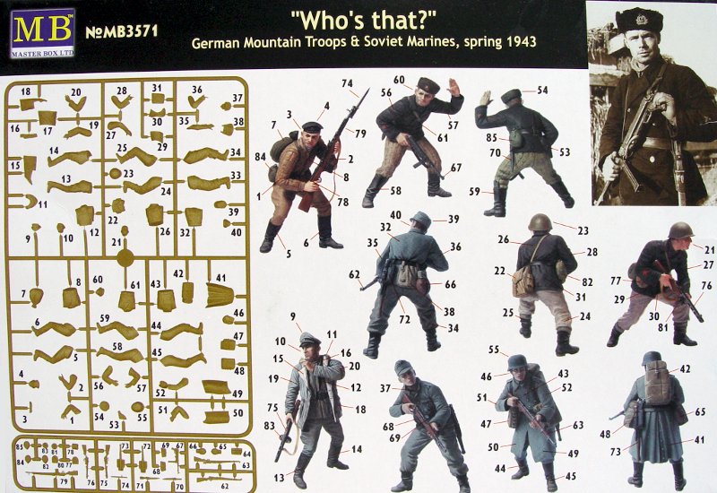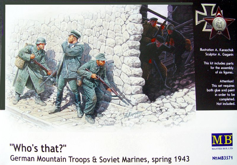 Der Figurenbausatz präsentiert sich in einer Faltschachtel wie bei MB üblich. Im Bausatz befinden sich 6 Figuren. Und zwar 3 deutsche Gebirgsjäger und 3 sowjetische Marineinfanteristen. Das Deckbild ist sehr schön gestaltet. Es zeigt wie sich die zwei Gruppen gegenseitig an einer Mauer belauern.