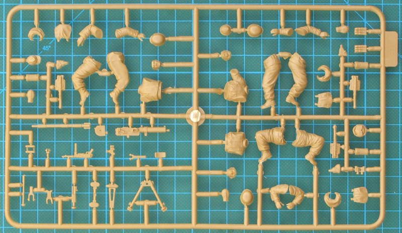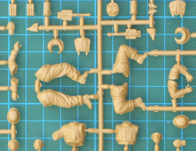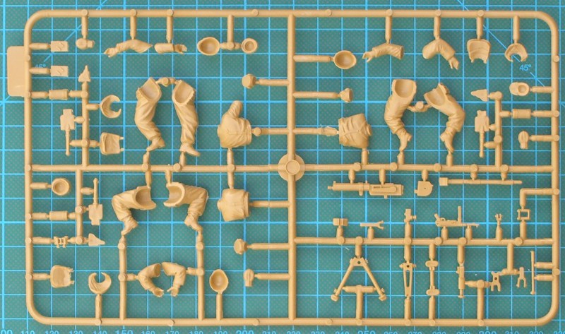 Bausatz: Master Box aus der Ukraine hat hier wieder mal ein interessantes Thema aufgegriffen. Hier werden drei Soldaten der Wehrmacht in der Bekleidung von Ende 1944 wiedergegeben. Sie haben z.T. sehr unterschiedliche Ausrüstung. Leider ist der Karabiner 98k vom Cover nicht enthalten. Ungewöhnlich ist auch das wassergekühlte MG 08/15. Die Figuren und die Ausrüstungsgegenstände sind sehr gut und fein wiedergegeben. Das Material ist nicht so hart aber es ist kein Weichplastik. Proportionen und Faltenwurf sind stimmig.