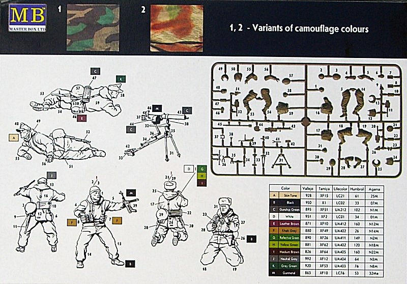Die Kartonrückseite zeigt die Figuren und benennt die Bauteile. Es gibt ein zwei Abbildungen der damals verwandten Stoffmuster. Schön sind die Farbhinweise für die Systeme von Vallejo, Tamiya, Lifecolor, Humbrol und Agama.