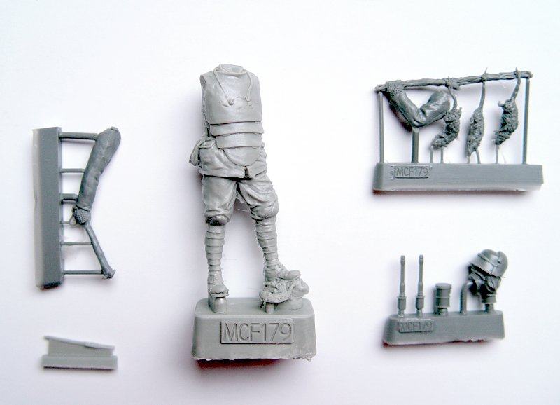 Masterclub ein Modellbauhersteller aus Russland hat einen deutschen Pionier des ersten Weltkriegs der gerade tote Ratten einsammelt heraus gebracht. Er trägt dabei eine Gasmaske und eine Art Keule in seiner rechten Hand. Über der Schulter liegt ein weiterer Stock an dem die toten, eingesammelten Ratten hängen. Die Darstellung ist nicht gerade mein Geschmack.