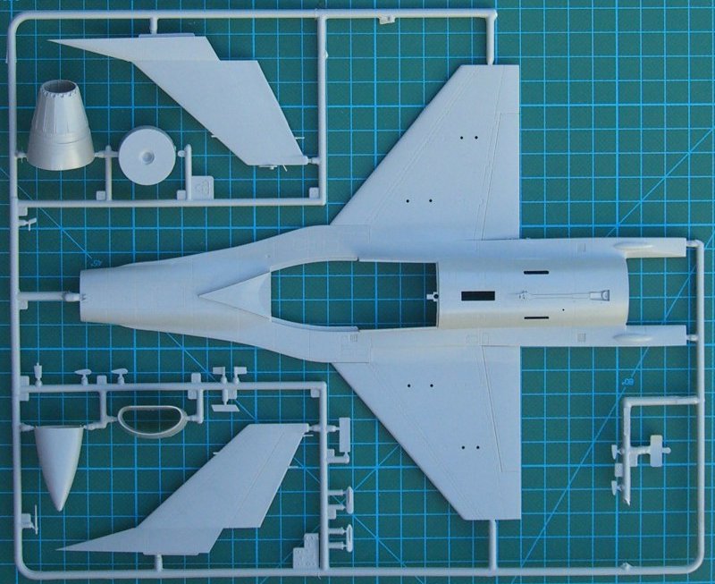 Der Schleudersitz besteht aus fünf Teilen und mit gewissem Geschick kann es ganz ordentlich aussehen. Da der Bausatz aus Ober und Unterseite mit angespritzten Tragflächen und Höhenrudern besteht erspart sich der Modellbauer eine Menge Stress beim Ausrichten derselben. Der Triebwerksauslass hat eine ordentliche Struktur und ist sehr gut brauchbar. Da der Lufteinlauf separat montiert wird, kann sich der Modellbauer gut auf die Montage der fünf Teile konzentrieren und die Klebenähte leichter verschleifen.