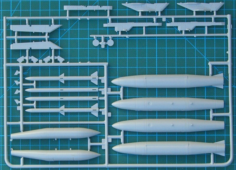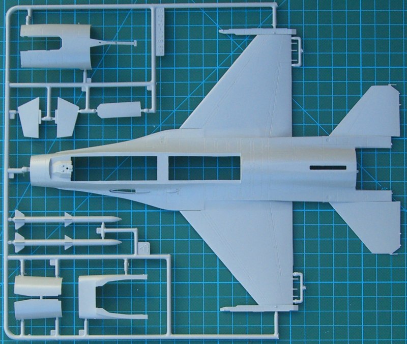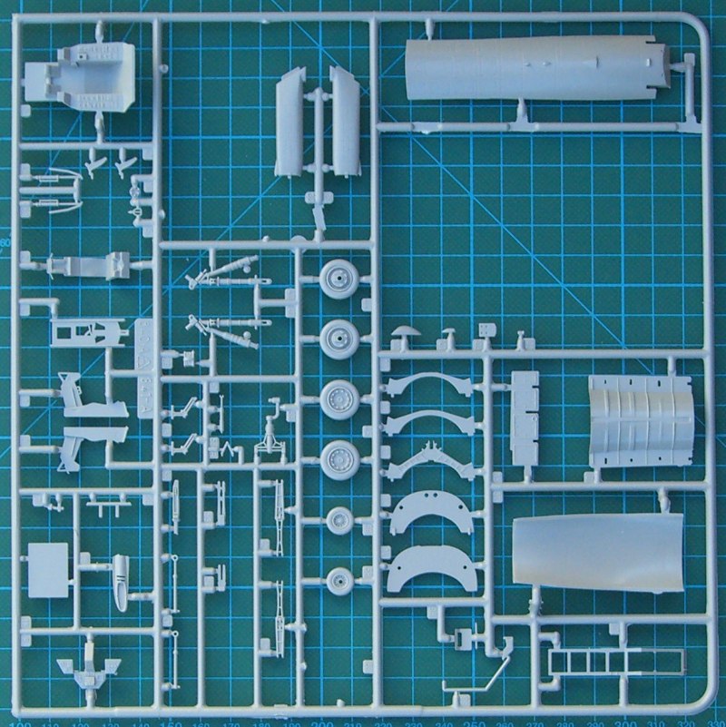 Der Bausatz enthält vier hellgraue Spritzlinge und separat verpackte Klarsichtteile. Die Spritzlinge sind bekannt, stammen diese doch aus dem Hause Italeri. Dieser Bausatz bietet eine "solide Hausmannskost". Es gibt feine Gravuren, Instrumentenbretter mit erhabenen Strukturen, einen Spritzling mit Bewaffnung und Zusatztanks. Die Bauanleitung ist übersichtlich und lässt keine Fragen offen. In den Bemalungshinweisen wird der FS-Farbton noch verbal in englischer Sprache bezeichnet.