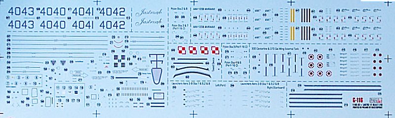 Die Fahrwerksschächte sind einfach detailliert. Für die Kanzel gibt es zwei Optionen: Offen oder geschlossen. Leider ist das Klarsichtteil nicht leicht getönt. Wer das möchte, der muss ein wenig mit klarer Farbe nachhelfen. Für die Bewaffnung gibt es eine Menge Decals und die Bauanleitung zeigt auch gut wo diese platziert werden sollen. Der trotzdem sehr umfangreich ausgefallene Decalbogen besteht aus hellblauem Trägerpapier und einem versatzfreien Druck der Beschriftungen.