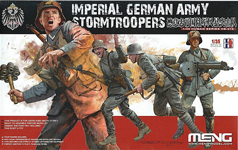Bausatz: Der neue Figurenbausatz stellt prinzipiell eine ideale Ergänzung des inzwischen recht umfangreichen Sortimentes von Modellbausätzen aus der Schmiede von Meng für den Zeitraum des ersten Weltkrieges dar. Der Karton ist sehr anspruchsvoll gestaltet und reiht sich in Bezug auf dessen Format sehr gut im Regal neben allen anderen gängigen Figurenbausätzen ein.