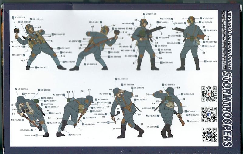 Bemalung: Als Bauplan sind die Figuren in unterschiedlichen Ansichten mit den Teilenummern auf der Rückseite des Kartons dargestellt. Für die Bemalung findet man eine Referenz auf die Farbenpalette von AK auf der Längsseite des Kartons.