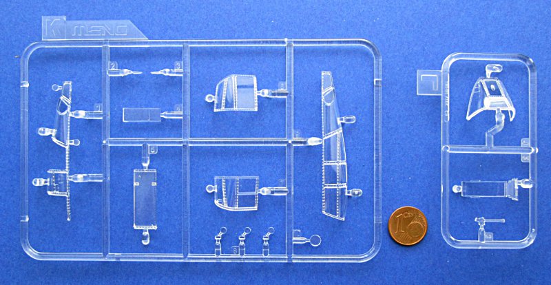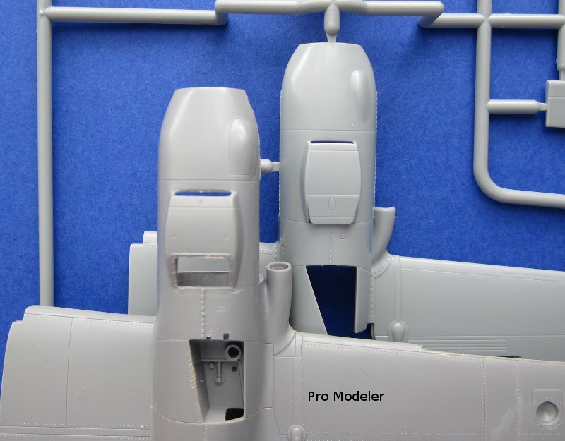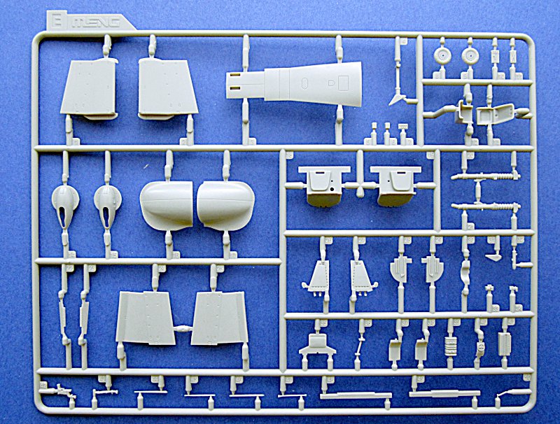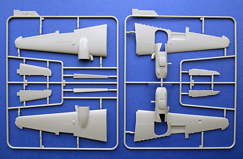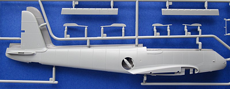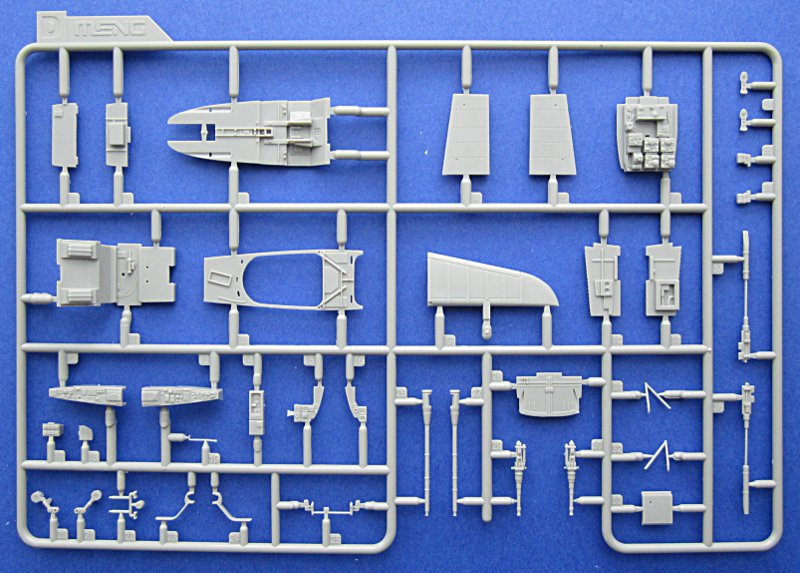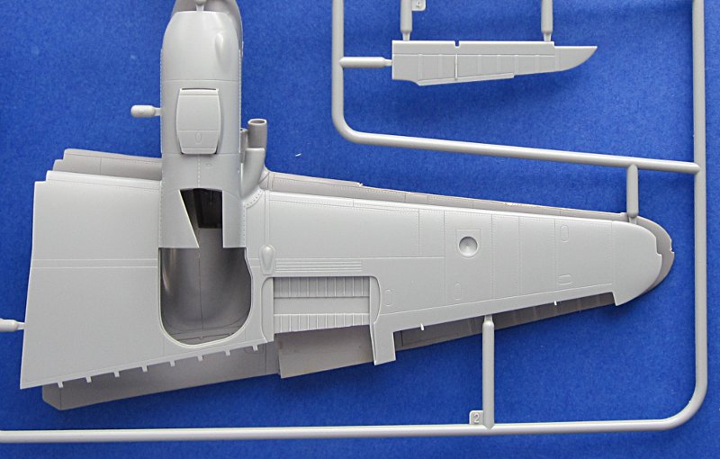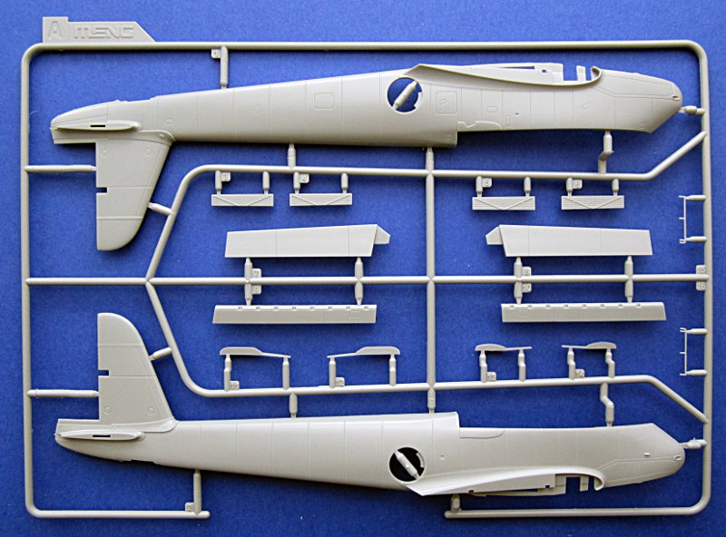 Die Abspritzung ist von sehr guter Qualität und die Oberflächendetails mit Gravuren mittlerer Breite und feinen Nietenreihen sind in Ordnung. Am Cockpit und der Seitenruderwurzel sind Überlappungen von Blechen dargestellt. Diese sind völlig übertrieben und viel zu dick. Gleiches gilt für einige andere Oberflächendetails und die Darstellung der Rahmenstruktur der Klarteile (innen und außen). Die komplex geformte Kanzel kann offen dargestellt werden und muss aus mehreren Teilen zusammengeklebt werden (Seitenteile und „Dach“). Dies erschwert den Bau, vermindert aber Verzerrungen. Leider ist die Kanzel trotzdem fast so dick wie beim Revell/Monogram-Bausatz.