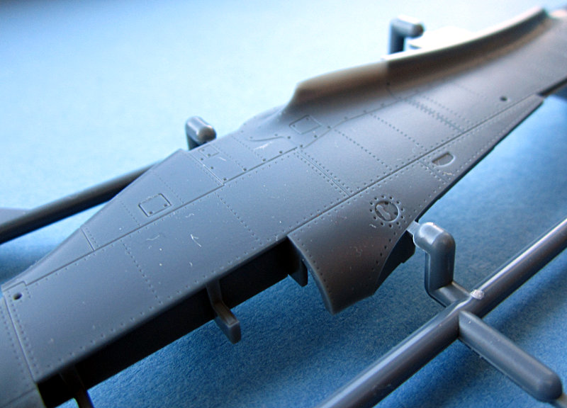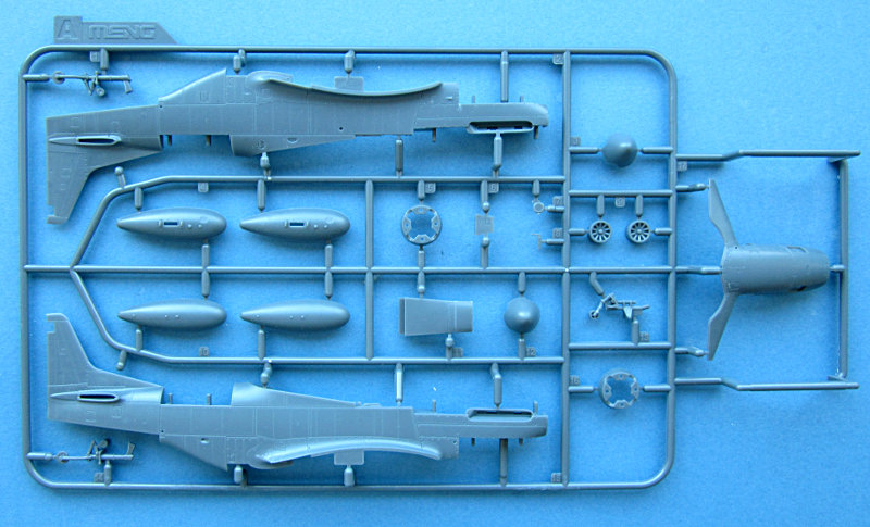 Die Angüsse sind nicht immer glücklich platziert und persönlich halte ich die Verwendung einer feinen Modellsäge zum Heraustrennen der Teile für erforderlich. Für den Bau gibt es einige Optionsteile. So können zwei verschiedene Arten Zusatztanks sowie Bomben unter den Flügeln montiert werden. Das Modell kann mit einem von zwei Propellern ausgestattet werden, wobei in der Bauanleitung nur der verkleidete ("cuffed") Propeller Erwähnung findet. Auch die mittels Slide Molds hohl abgespritzten Auspuffstutzen können in zwei Varianten verwendet werden, mit Ummantelung (shrouded) und ohne. Zwei verschiedene Hauben liegen bei, es bleibt aber offen, welche verwendet werden soll. Auch sollte an der Kanzel die feine Formtrennaht entfernt werden. Die Steuerflächen der Höhenruder sind in neutralposition angegossen. Seitenruder und Querruder sind separate Teile und könnten ausgelenkt montiert werden, wenn man die Montagezapfen entfernt und die Steuerflächen anklebt. Die Landeklappen sind zur ausgefahrenen Montage vorgesehen. Das Anbringen in eingefahrener Position erfordert etwas mehr Arbeitsaufwand, ist aber machbar.