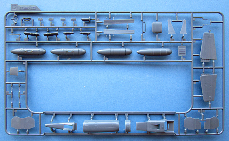 Das wars dann aber schon, was ich zu bemängeln habe, ohne das modell zu bauen. Im stabilen Stülpkarton finden sich 3 große und zwei mittelgroße garue Spritzlinge, so wie einer mit den Klarteilen. Die Oberflächen sind sehr ansprechend gestaltet und weisen feine versenkte und erhabene Details auf. Sicher werden einige monieren, dass die Laminarflügel meist gespachtelt und lackiert waren. Mir macht das nichts aus, denn ich mag strukturierte Oberflächen am Modell. Die Aufteilung ist meist konventionell, allerdings gibt es hier und da einige Lösungen, die eine Klebstofffreie Komplettierung des Modells erlauben bzw. Stoßkanten vermeiden helfen, zum Beispiel die obere und untere Motorabdeckung am Bug. Wie Brett Green beschreibt, sind auch die Fahrwerksbeine frühzeitig einzusetzen, was Bruchgefahr bedeutet.