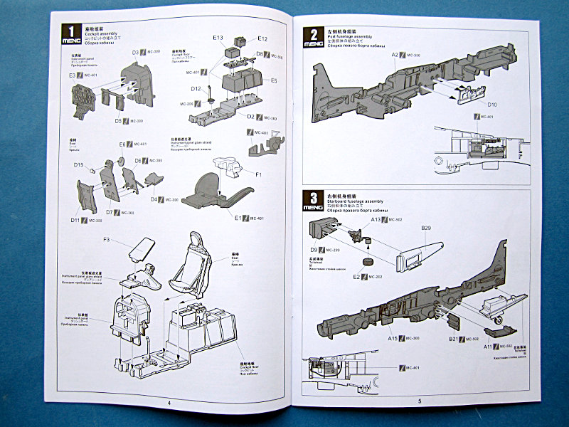 Die Bauanleitung finde ich nicht wirklich für den Einsteiger geeignet, da Einiges wegen der starken Striche nicht gut zu erkennen ist und die Grautöne der Anleitung nicht immer gut zu unterscheiden sind. Wer mal eine Lego Bauanleitung gesehen hat, weiß, was ich eher erwartet hätte. Als lästig empfinde ich auch die Farbhinweise. Meng hat sich von AK interactive ein eigenes Farbsystem stricken lassen und gibt an den entsprechenden Stellen lediglich die MCxxx Nummer an. In der Tabelle vorn in der Bauanleitung finden sich diese Farbcodes ganz rechts, was der westlichen Leserichtung entgegenläuft. Vorher sieht man die chinesische, englische, japanische und russische Bezeichnung der Farbe. Diese Sprachen ziehen sich auch durch die Bauanleitung.