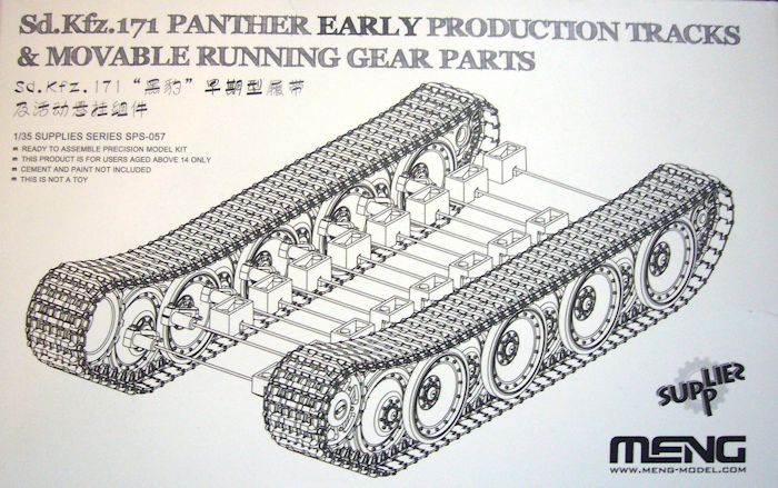 Bausatz: Zum deutschen Panzer Sd.Kfz. 171 Panther muss ich nichts mehr sagen, denn derzeit sind die Regale voll mit diversen Neuheiten. Ob Ausführung D, A, G oder Bergepanther, die großen Hersteller machen sich derzeit Konkurrenz, was das Zeug hält. Konsequent bietet Meng nun auch für seine Bausätze des Panthers in den frühen Versionen passende Einzelglieder Ketten an. Zusätzlich im diesem Bausatz enthalten sind auch die Befestigungsteile für eine voll funktionstüchtige Drehstabfederung. In einem kleinen und übersichtlichen Pappkarton findet man alle Teile, die man für dieses Unterfangen benötigt: