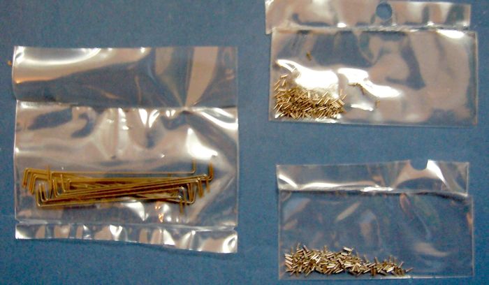 drei Tüten mitunzähligen winzigen Bolzenenden zur Verbindung der Kettenteile, eine Tüte mit Federungen der Drehstabfederung aus Metalldraht