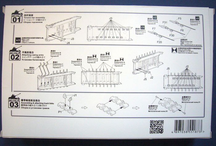 Bauanleitung/ Bemalung: Die Bauanleitung findet sich auf der Rückseite des Kartons und zeigt in insgesamt drei Hauptschritten, wie man das Detailset nutzen kann. Im ersten Schritt sieht man wie die Halterungen und Federn in der Wanne des Bausatzes zu befestigen sind. Im nächsten Abschnitt erfolgt der Einbau der Schwingarme aus dem Bausatz und im letzten Abschnitt ist die Verbindung der Einzelglieder-Kettenteile miteinander sowie das Anbringen der Führungszähne abgebildet.