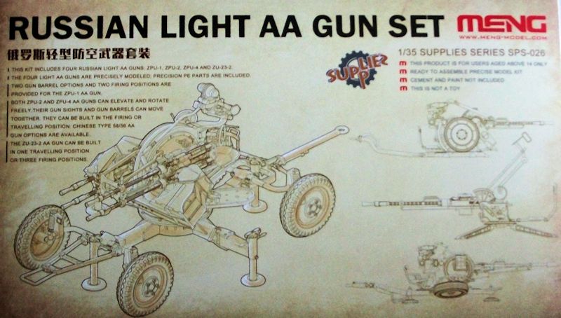 Bausatz: Der Bausatz enthält an sieben Gussästen sauber und filigran gespritzte Plastikteile. Ein kleiner Ätzteilsatz ist vorhanden. Der zweiunddreißigseitige Bauplan enthält neben den Abbildungen der Güssäste, den Baustufen auch Hinweise, wie die Geschütze auf Fahrzeuge aufgebaut, abgeprotzt und aufgeprotzt dargestellt werden können. Für die ZPU Varianten liegen noch chinesische Rohre für die Typen 80 (ZPU-1), Typ 58 (ZPU-2) und Typ 56 (ZPU-4) bei.