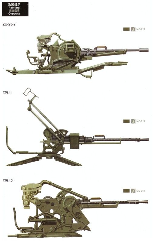 Die Bemalungshinweise zeigen die Waffen einheitlich in grün und die ZPU-4 zusätzlich in Sandfarbe. Die Decals liegen nicht bei.