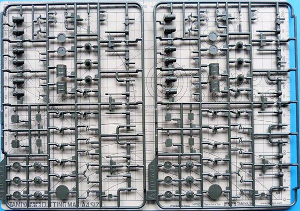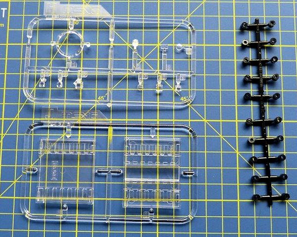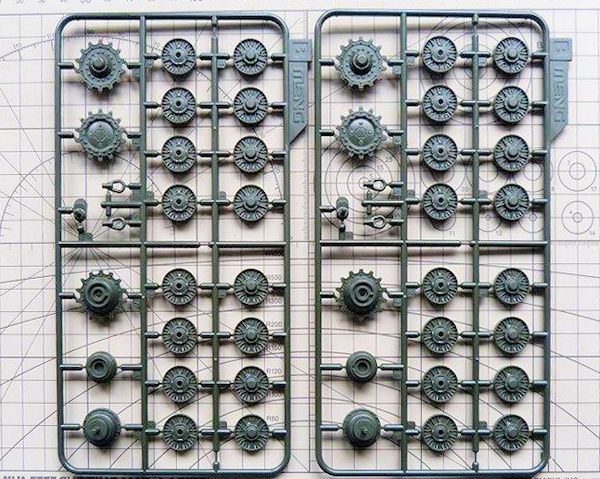 Allein acht Gussrahmen sind für die schön detaillierte Einzelgliederkette vorgesehen. Die Kette wird mit Bolzen verbunden, die dank einer Bauhilfe (Schablone) leicht zu verarbeiten sind. sie wird nicht verklebt und ist voll beweglich. Polycaps aus schwarzem Vinylmaterial halten die Laufrollen beweglich.