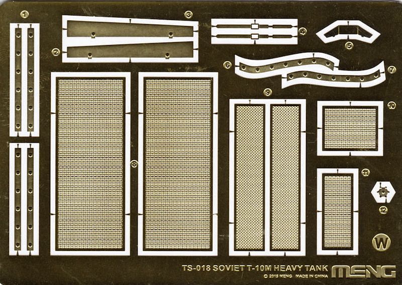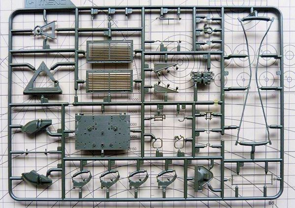Ober und Unterwanne liegen separat bei. Beide Teile weisen eine sehr gut ausgearbeitete Gussstruktur auf. Kanone und Fahrer und Kommandantenluke lassen sich beweglich einbauen. Als Abschluss liegt ein sinnvoller Ätzteilbogen bei. Auf ihm befinden sich größtenteils Lüftungsgrätings für den Heckbereich des Modells. Der Zubehörmarkt wird bestimmt noch einige Zurüstsets herausbringen. Aber da Meng schon eine sehr gute Detaillierung bietet, stellt sich hier die Sinnfrage.