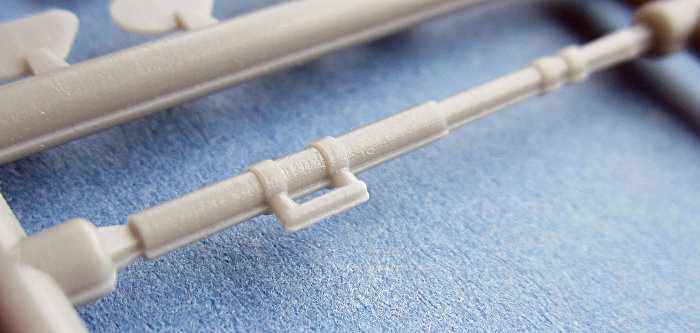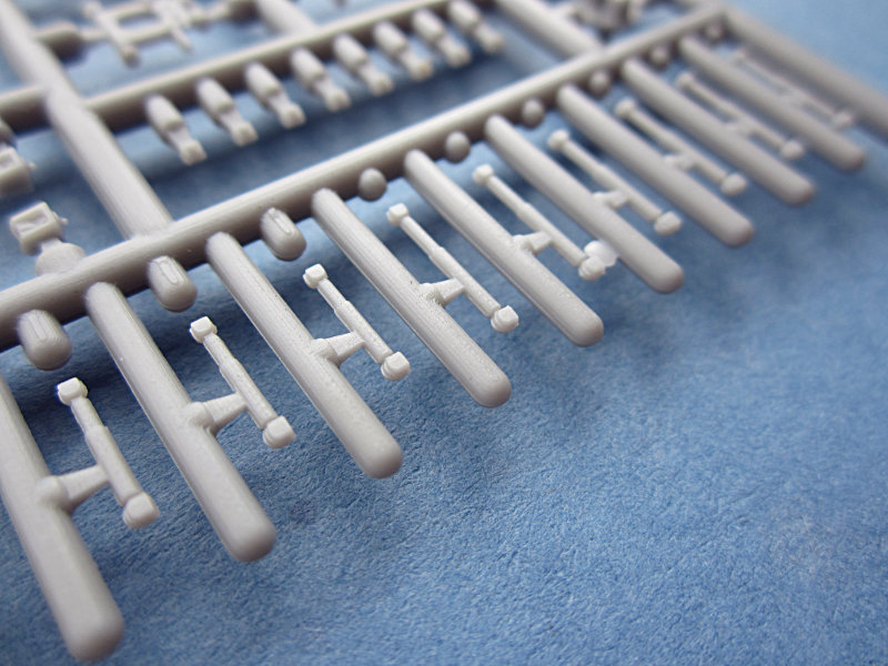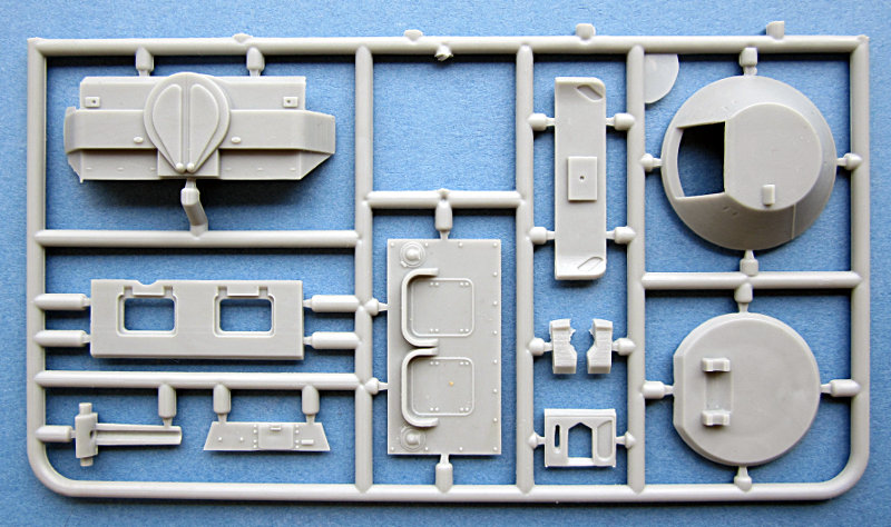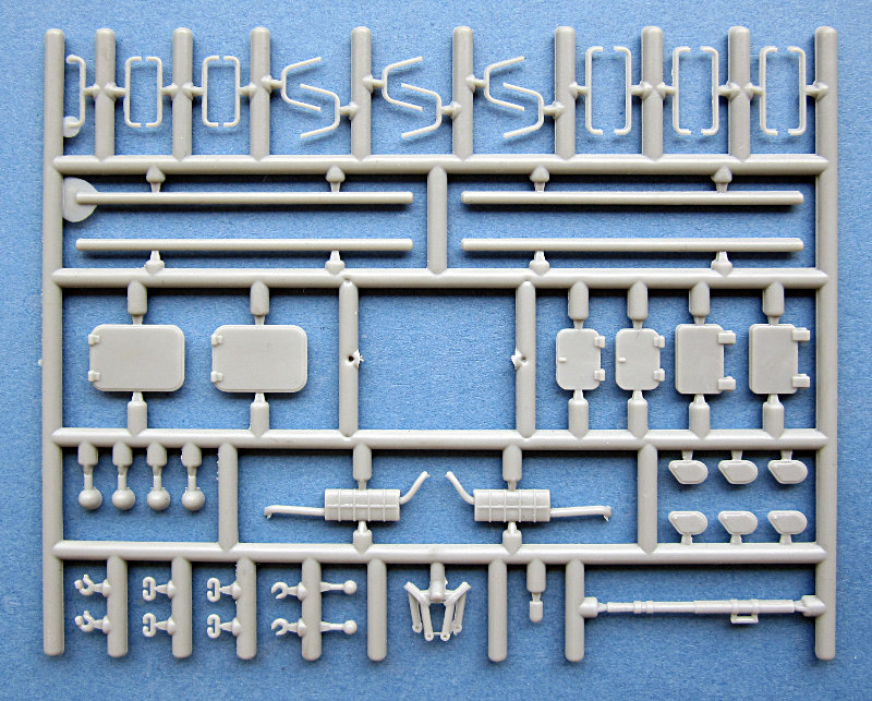 Der Spritzling mit den Achsen und Griffstangen hat bei meinem Exemplar einen leichten Versatz. Dies betrifft leider auch die Kanone. Dies ist eines der wenigen Teile für welche man Ersatz braucht. Erstaunlicherweise sind die Schäkel und Ösen am gleichen Rahmen ziemlich gut. Die Auspufftöpfe und Rohre sind vereinfacht. Die Scheinwerfer haben ein kleines Sinkloch, welches man aber prima zum Ausbohren/-fräsen nutzen kann. Bei den Tarnscheinwerfern muss es natürlich verspachtelt werden.