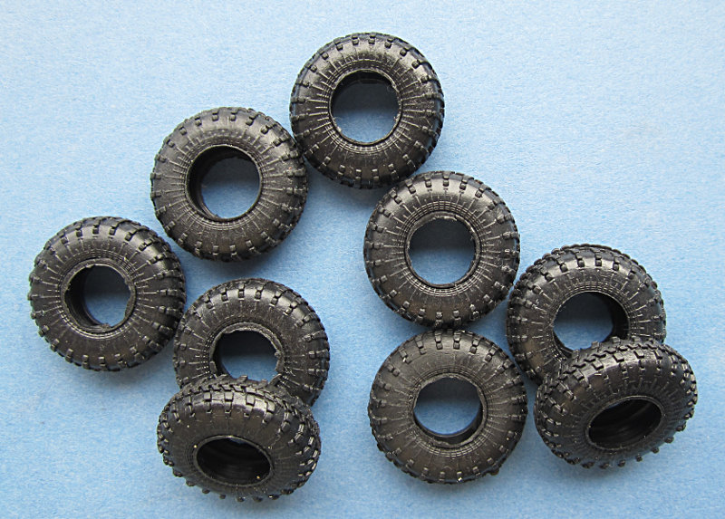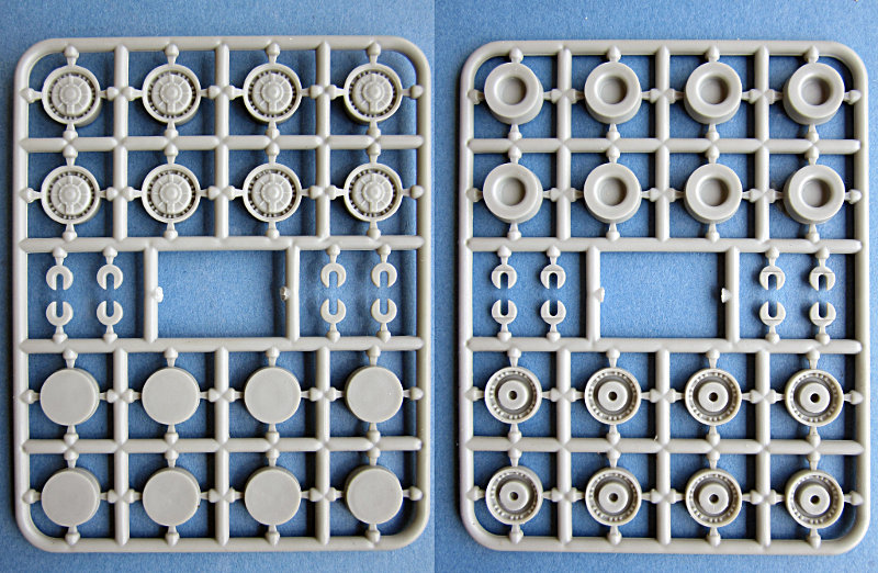 Die Felgen der Räder sind zweiteilig konisch, so dass zwischen ihnen der Gummireifen eingeklebt werden sollen. Die Reifen selbst sind – abgesehen vom Material – garnicht mal schlecht. Allerdings fällt im Vergleich mit den Haulerrädern auf, dass sie etwas schwachbrüstig sind. Leider ist das typische abgeplattet/ausgebeulte Aussehen der Räder wie auf dem Titelbild nicht nachgebildet. Ein kleiner Fotoätzteilbogen rundet den Bausatz ab.