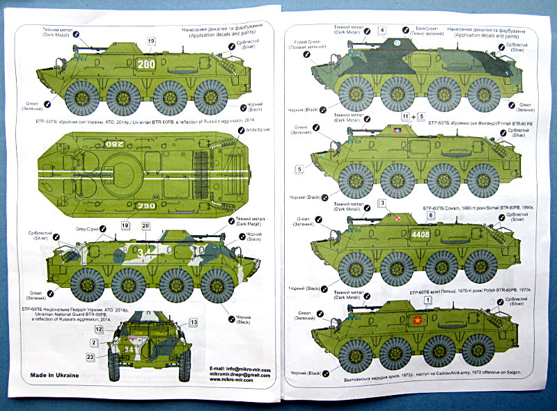 Mittels der Nassschiebebilder können 11 Bemalungsvarianten dargestellt werden. Wie bei den meisten Decals aus Osteuropa wirken diese gelblich. Ich habe mit solchen Decals schon gute und schlechte Erfahrungen gemacht, daher muss erst der Bau zeigen, ob diese etwas taugen.