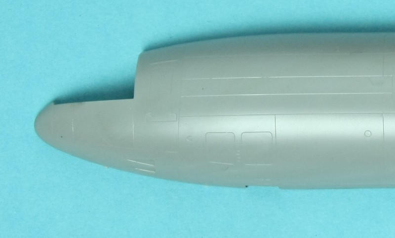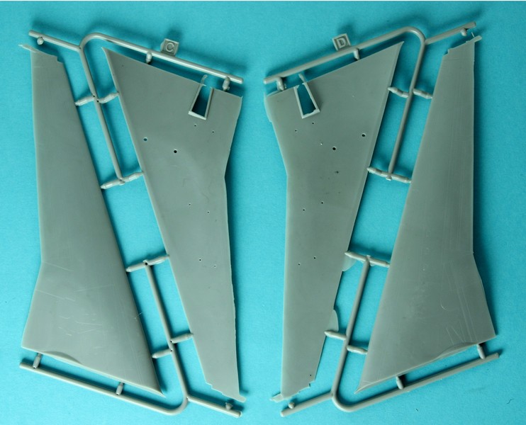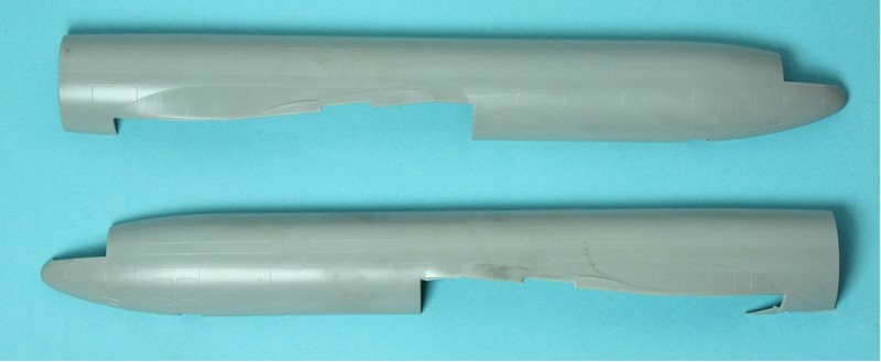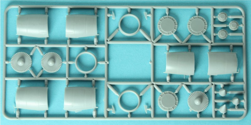 Ich weiß es nicht genau, aber vermutlich bedingt durch die Größe des Originales(und dem Modell als Folge) und den Limits der Formgröße entsteht der Rumpf aus den beiden großen Schalen und zwei Heckteilen samt Seitenleitwerk und dem Zweier-Triebwerk. Dieses und auch die beiden Flügelmotoren sind klassisch längsgeteilt, was etwas Versäuberungsaufwand an der Naht vermuten lässt. Der Einlassring ist aber einteilig! Der Kit enthält übrigens die General Electric CF6-80C2D1F mit den späteren, spitzen Konus im Auslass des Heißteils. Ein weiteres Merkmal der kleinen Unterschiede innerhalb der MD-11 Serie ist der frühe Einlass des mittleren Triebwerkes. Dieser wurde bei den ersten 128 Maschinen verbaut. Die verbleibenden 72 Restlichen haben einen etwas anders geformten Einlass, bei dem die Wölbung etwas länger ist und schräg abschließt. Dieser und andere Unterschiede werden sehr gut erklärt in diesem Guide auf Airlinercafé.