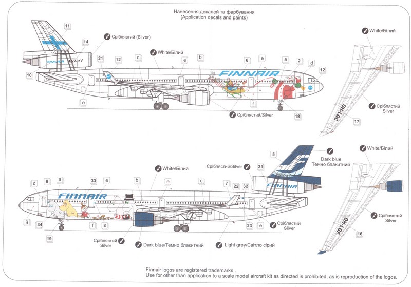 Die Bemalungsanleitung ist ehrlich gesagt auch ein Schwachpunkt in diesem sonst tollen Bausatz. Neben der fehlenden Beschreibung der Citybird-Maschine ist auch die Anleitung für die Finnair-Optionen etwas fehlerhaft. Die Flügel und auch im Falle der -LGC die Triebwerke sind nämlich grau. Dank den einschlägigen Fotoseiten im Netz ist das aber nicht ein großes Geheimnis und auch für jeden Modellbauer leicht nachzuvollziehen. Die Abziehbilder machen zunächst einen guten Eindruck.