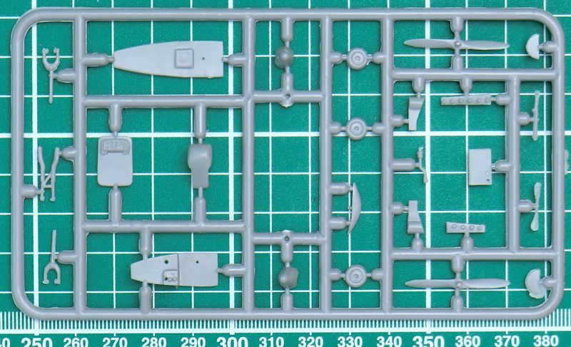 Die beiden Luftschrauben bestehen aus jeweils einem Teil und werden mit einem Spinner versehen. Sie werden einfach so in die Motorverkleidung gesteckt. Auf ein Buggewicht weist die Bauanleitung nicht hin. Durch den Heckausleger dürfte eine gewisse Hecklastigkeit vorhanden sein.