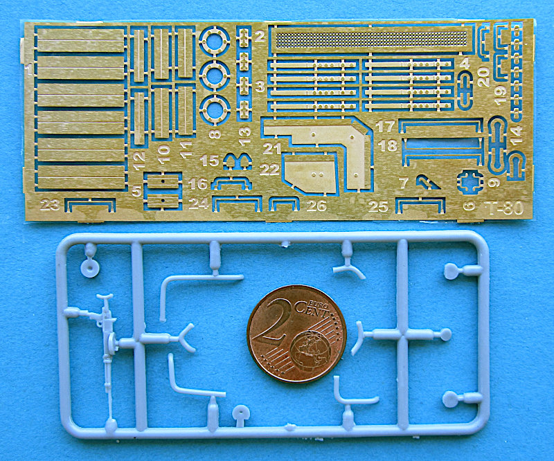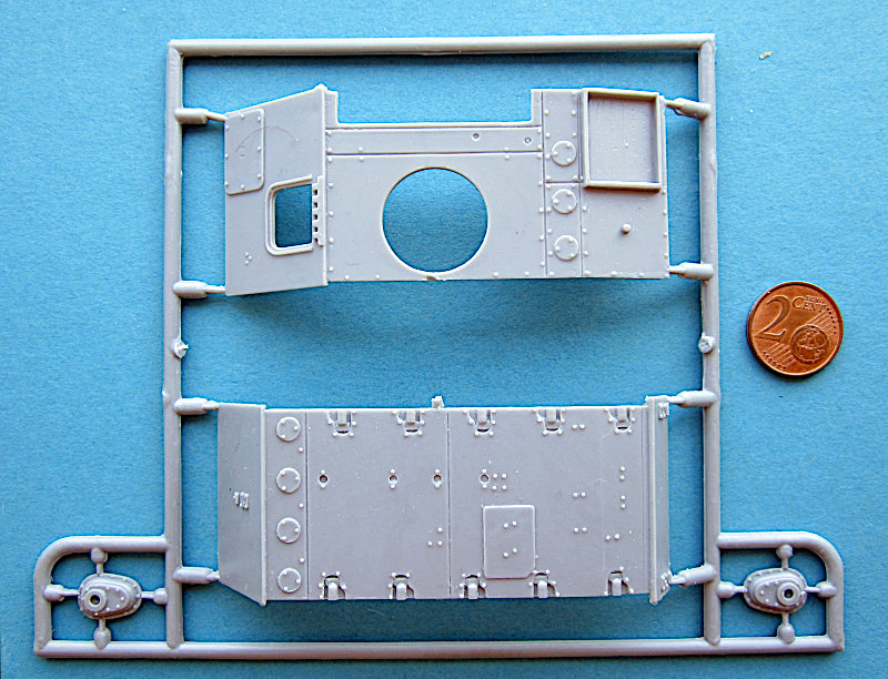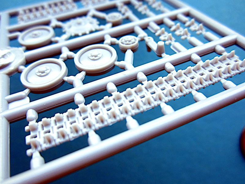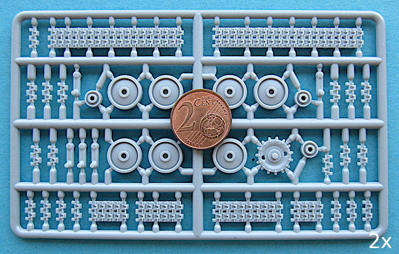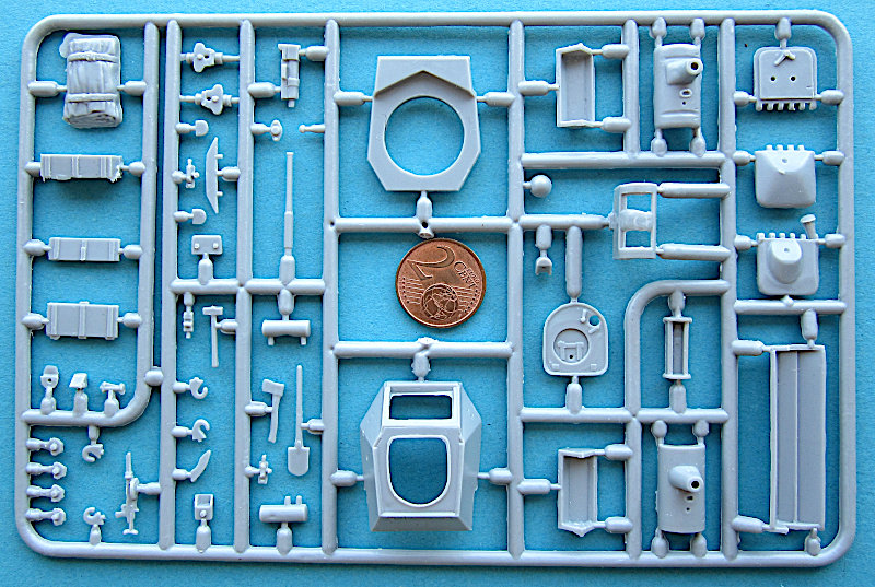 Besonders gut gefallen mir die „Link & Length“ Ketten an den beiden Spritzlingen D. Diese sind sehr schön gestalten und vereinfachen den Bau deutlich. Auch ein paar Kisten und eine zusammengerollte Plane finden sich an den Spritzlingen, so dass bei einer Darstellung m Diorama schon ein paar Hilfsmittel enthalten sind. Die bereits erwähnten Fotoätzteile enthalten Verstärkungsbänder für den geschweißten Turm, Lamellen für das Lüftungsgitter auf dem Heck, ein Gitter für den Schacht neben dem Turm und ein paar Heißösen und kleinere Details.