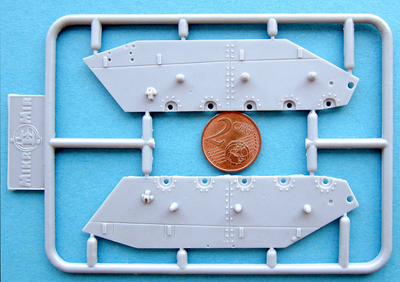 Bausatz: Der Bausatz des sowjetischen Panzers präsentiert sich in der von MikroMir gewohnten Aufmachung im grünen Stülpkarton. Die Wandung der Verpackung ist recht dünn aber in der Konstruktion ausreichend stabil. Im Inneren befinden sich 8 graue Spritzlinge von denen die größten etwa das Format A5 erreichen. Die Gießrahmen haben einen leichten Ölfilm und sollten auf jeden Fall vor dem Bau, spätestens vor dem Lackieren in Seifenlauge gereinigt werden.