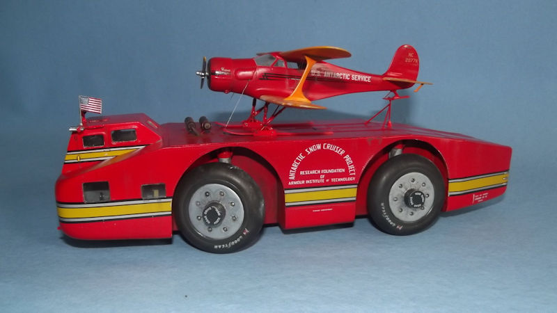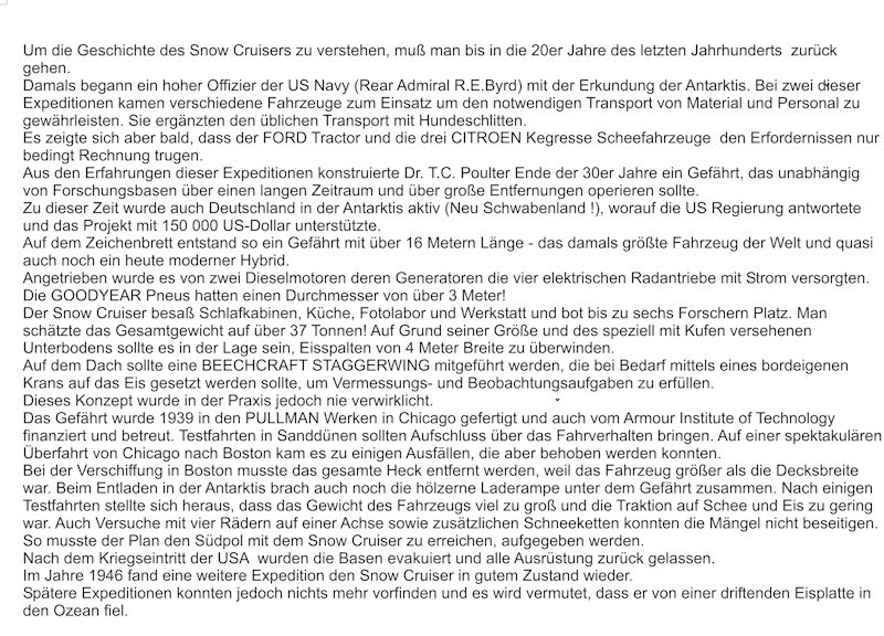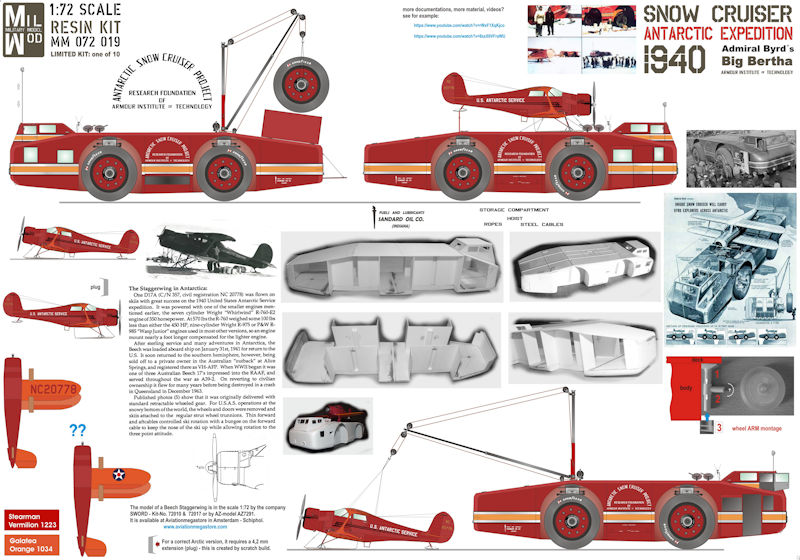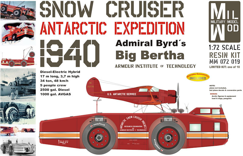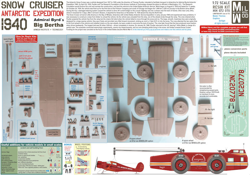Bausatz: Nachdem die Firma Military Model - MilMod - 2016 in Telford mit dem TEL für die Minuteman II ihren ersten Resin Kit vorgestellt hat, umfasst das Programm nunmehr bereits rund 100 Bausätze. Alle werden nur in Mini-Auflagen zwischen 10 und 25 Stück gefertigt, sind also fast Unikate. So auch hier: Auf der attraktiven Schachtel unseres Snow Cruisers ist die Angabe von 10 Kits (!) vermerkt - entsprechend sind auch die Verkaufspreise. Die MilMod-Range teilt sich auf in eine reinrassige 1:72 Serie: Letztere ist an den Kit-Nummern MM 072 xxx erkennbar; hier gehört also unser Snow Cruiser hinein. Eine Zubehör-Serie für 72er und 76er Kits ab MM 072 8xx und eine Airfield-Serie Maßstab 72/00, also 1:76 - Kit-Nummern MM 000 xxx. Markenzeichen bei MilMod ist die Beigabe von Figuren, Beladungsstücken und allerlei Teilen für perfekte Dioramaszenerien - in diesem Falle von Winden- und Ladebaum-Equipment, arktischen Figuren, Hunden und Pinguinen!