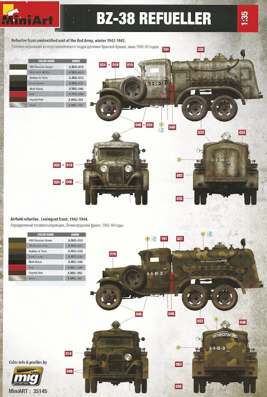 Bemalungsvarianten: Die Abziehbilder sind sauber und randscharf gedruckt. Die Bemalungsanleitung, bezogen auf das Farbensortiment von Mig, gibt vier darstellbare BZ-38 an.