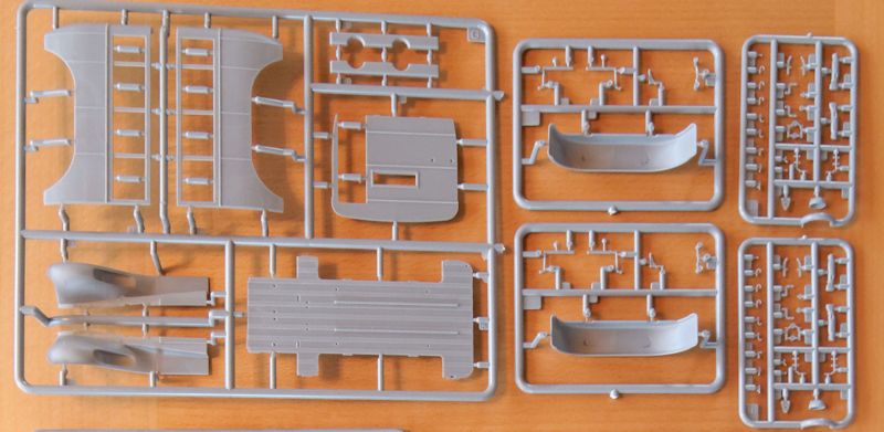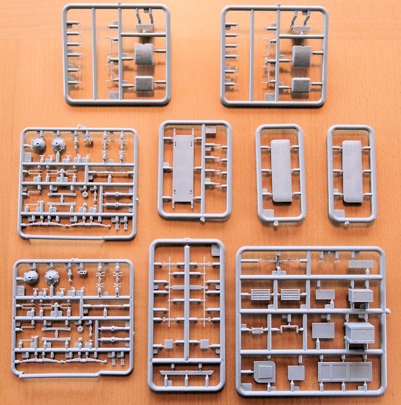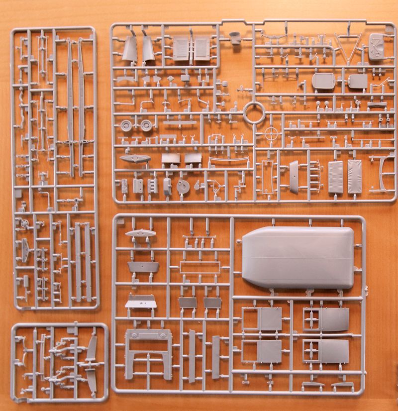 Bausatz: Dieser Bausatz strotzt vor Einzelteilen. Der prall gefüllte Kasten enthält neben 388 Plastik- zusätzlich 18 Klarsichtteile sowie eine Platine mit acht Ätzteilen. Die insgesamt 414 Teile sind ausgezeichnet detailliert und entsprechen einem Niveau das man von Dragon oder Bronco kennt.