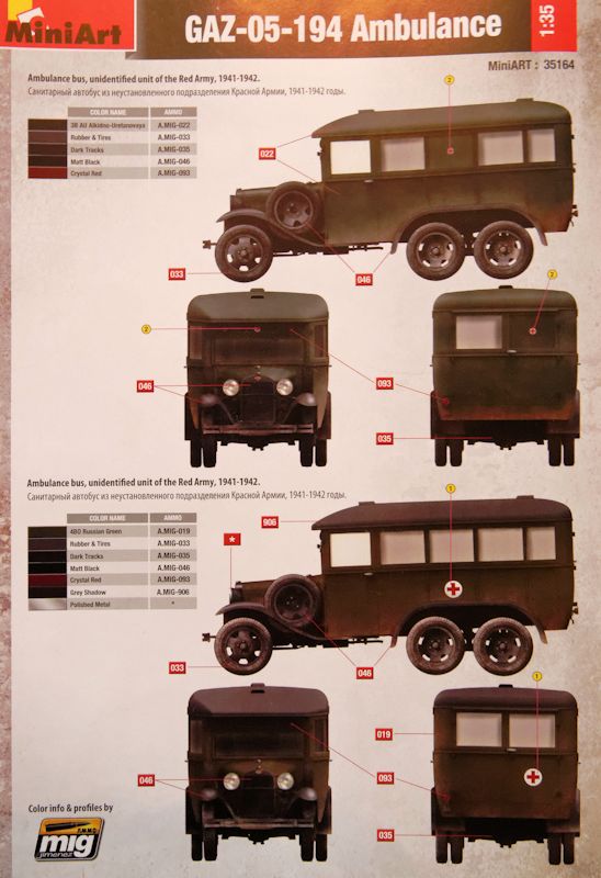 Vorbild: Nachdem MiniArt inzwischen 13 verschiedene Versionen von diesem sowjetischen LKW, darunter acht als Dreiachser, herausgebracht hat, folgt hier eine weitere Ausführung als Ambulanz. Die UdSSR produzierte von diesem LKW rund 40.000 Stück in den Versionen AA = zwei Achsen sowie AAA = drei Achsen. Die Motorisierung bestand aus einem Vierzylinder Ottomotor mit 42 bzw. 50 PS. Die Höchstgeschwindigkeit betrug ca. 65 km/h. Der Verbrauch lag bei 25-27 l / 100 km. Für sowjetische Verhältnisse völlig normale Werte.