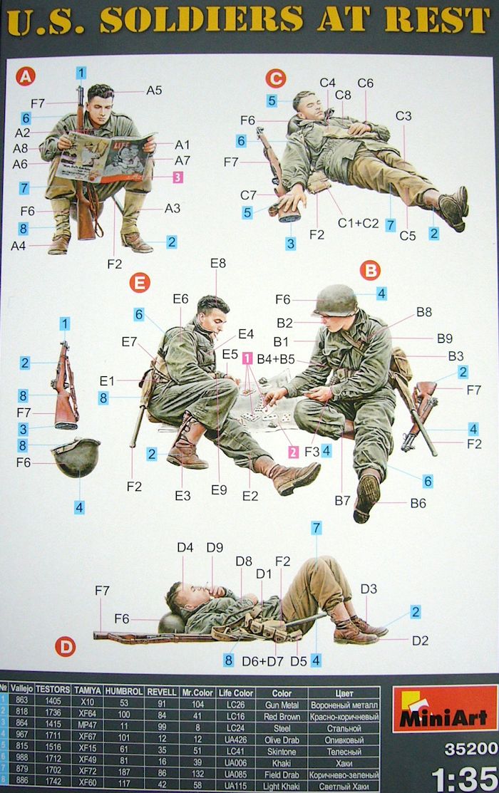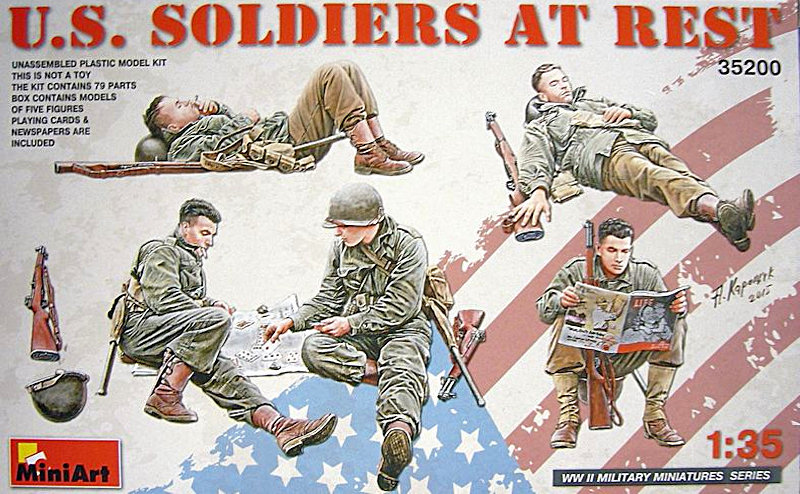 Seit einiger Zeit bieten verschiedene Hersteller Figurenbausätze an, die nicht nur Figuren in Aktion bzw. im Kampf darstellen, sondern auch in anderen Situationen wie beim Warten oder Reparieren von Fahrzeugen, beim Sport (Fußball oder Boxkampf) oder beim Essen. In diese Ecke reiht sich nun auch erfreulicherweise der neueste Figurenbausatz von MiniArt ein, der die Darstellung von fünf US GI bei der Rast in unterschiedlichsten Positionen ermöglicht.
