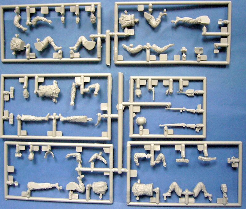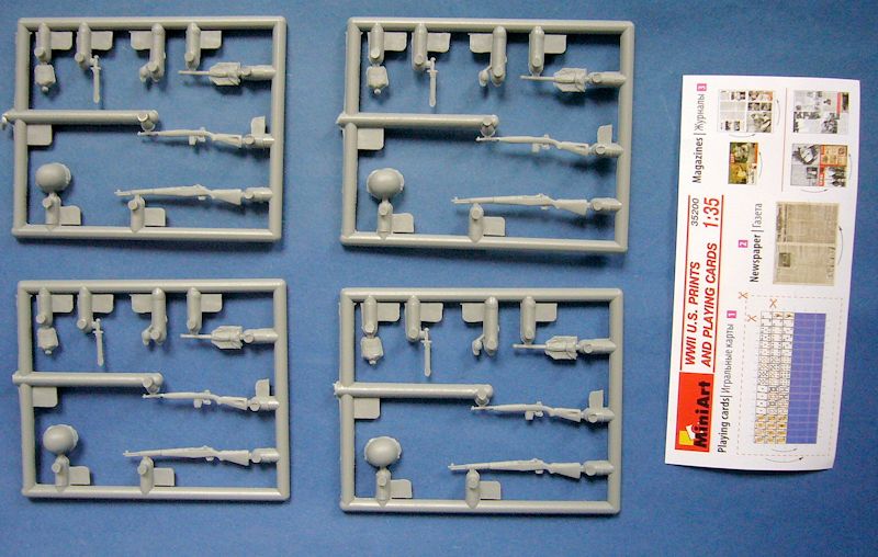 Auf fünf kleinen hellgrauen Spritzgussästen findet man bei diesem Bausatz sehr schön detaillierte Teile für die unterschiedlichen Soldaten. Zusätzlich liegen fünf weitere identische Gussäste mit Waffen und Ausrüstungsgegenständen bei. Wie bereits erwähnt, sind die Haltungen der Figuren sehr entspannt und decken Schlafhaltung oder Dösen, Lesen eines Magazins sowie ein Kartenspiel zu zweit ab. Die Anatomien sind dabei sehr gut wiedergegeben, aber mein absolutes Highlight findet man in Form eines sehr dünn ausgeführten Papieres, mit dem die Zeitschrift, das Kartenspiel sowie eine Landkarte maßstabsgetreu dargestellt werden können.