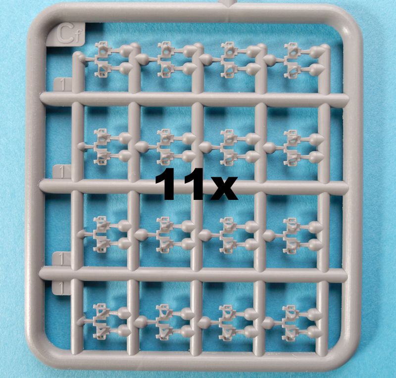 Der prall gefüllte Karton enthält fast mehr Einzelteile als das Original. Auf 33 hellgrauen und einem Klarsichtspritzling, dem Abziehbilderbogen und zwei Fotoätzplatinen (in eigener Kartonverpackung) warten, laut Angabe MiniArt, insgesamt 482 Teile auf die Montage. Die Angüsse sind schön dünn gehalten und die Detaillierung der Teile ist wirklich hervorragend. Mini Art hat anscheinend auch großen Wert darauf gelegt die Auswerfer Markierungen von den Bauteilen fernzuhalten und diese auf die Angüsse platziert.