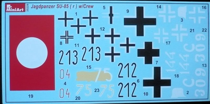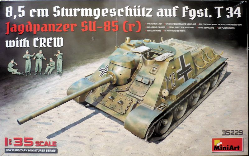 Bausatz: Nachdem die SU-85 durch die Instanzen " früh, mittel, mit und ohne Inneneinrichtung, mit und ohne Figuren" gegangen ist, ist das Erscheinen jetzt als Beutepanzer in der Modellpolitik von Miniart ein gewohnter Ablauf. Ein Bogen mit sowjetischen und deutschen Abziehbildern und eine fünfköpfige deutsche Figurencrew - fertig ist die deutsche SU.