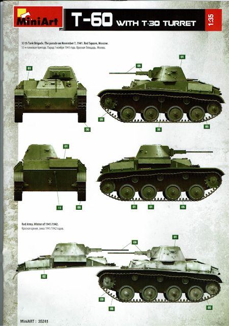 Bemalung: Über Abziehbilder verfügt dieser Bausatz nicht. Der Color Guide verweist auf zwei Darstellungsvarianten. Im unifarbenen Russischgrün von der 33. Panzerbrigade - Parade vom 7. November 1941 auf dem Roten Platz in Moskau und in weißer Wintertarnung aus der Winterperiode 1941 - 1942. Bei den Farben bezieht sich MiniArt auf die Hersteller Vallejo, Humbrol, Mr. Color, Testors und Ammo Mig.