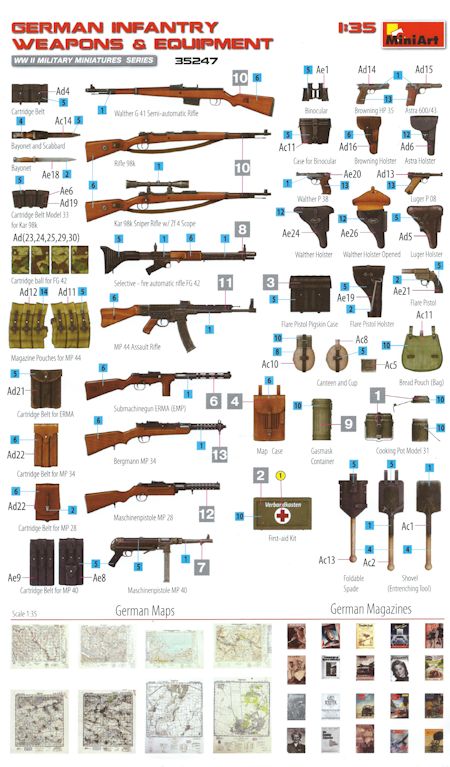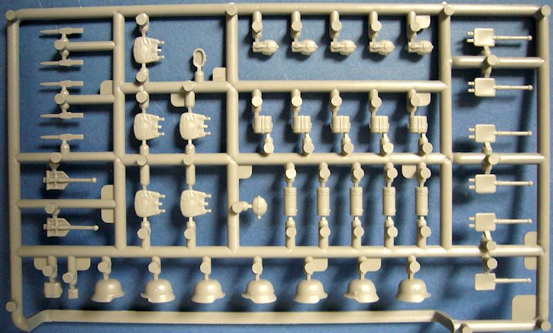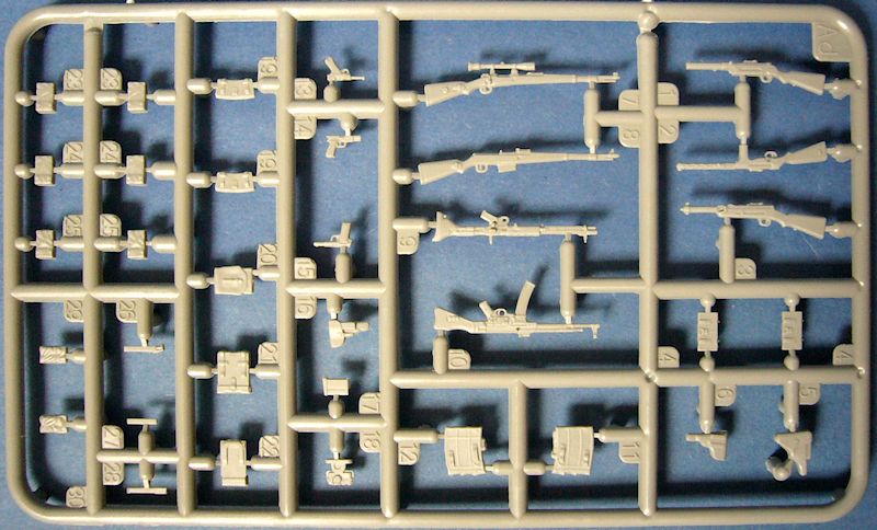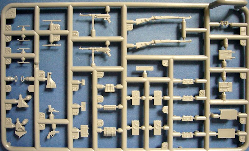 Miniart bietet nun ein Set mit deutschen Waffen und Ausrüstungsgegenständen des WK II an und dieser Bausatz hat es in sich! Es sind zwar nur drei Gussäste aus hellgrauem Plastikmaterial, aber was man darauf findet ist wirklich beeindruckend.