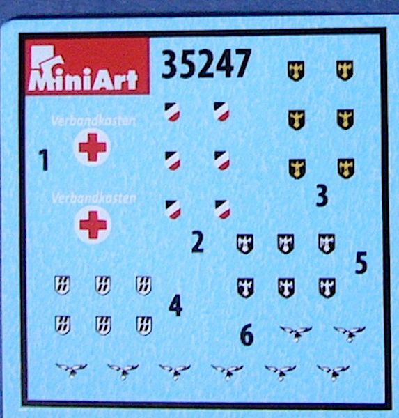 Den krönenden Abschluss bildet ein kleiner Abziehbilderbogen für die Helme und Beschriftungen der Ausrüstung, zum Beispiel für den Ersten Hilfe Kasten.